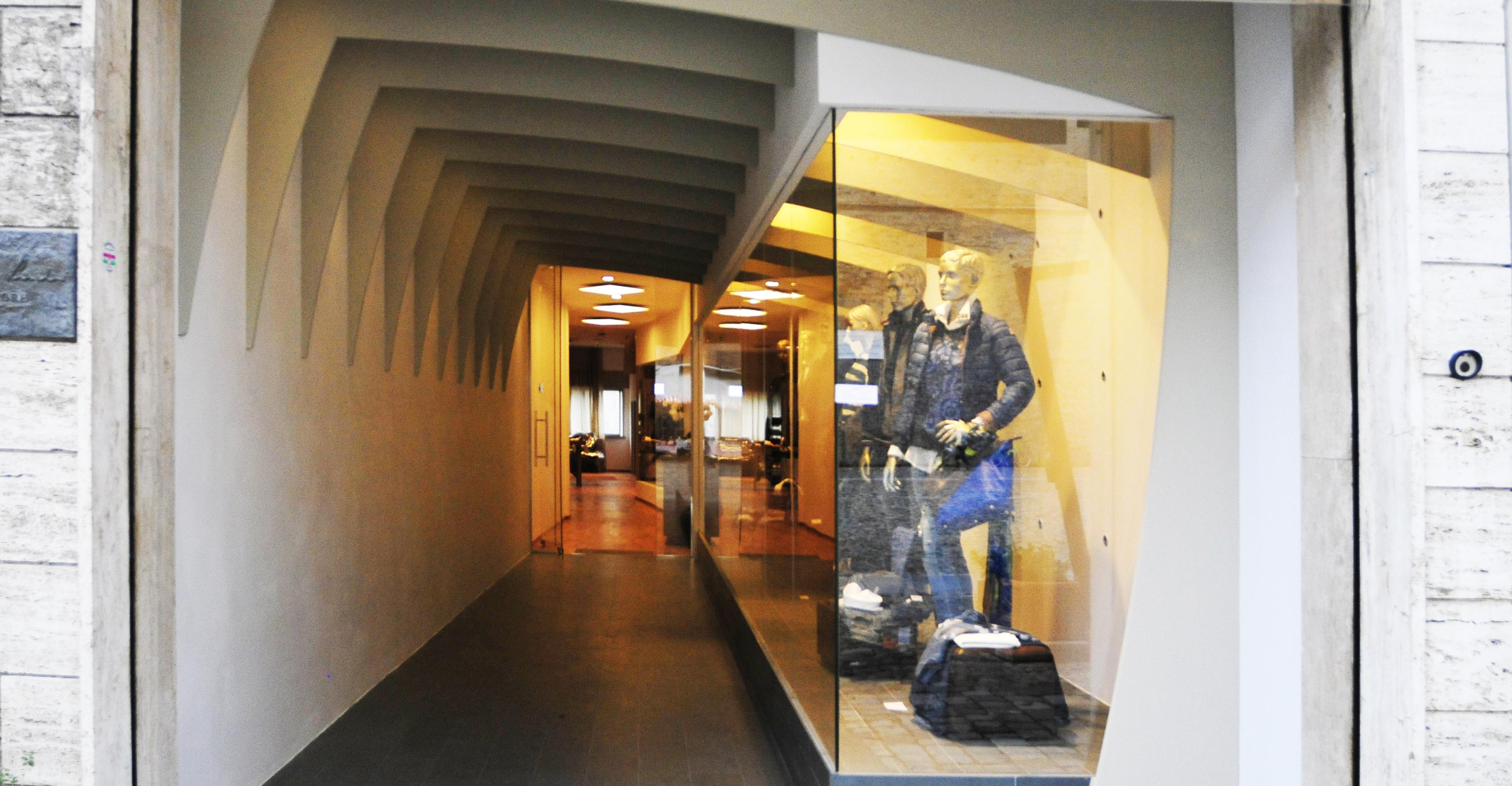 Grazie all'inserimento di portali che scandiscono l'entrata e compenetrano la vetrina itinerante, il negozio ha ora un design più accattivante e vivace nelle forme. Progetto realizzato dall' Arch. Stefano Magnani.